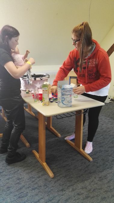 Etwas müde und mit Augenringen kamen heute die Schülerinnen, die sich diese Woche als „Mütter auf Probe“ versuchen, in den Klassenraum der Klasse L9. Sie mussten mehrere Male in der vergangenen Nacht aufstehen, um sich um die kleinen „Leihbabys“ zu sorgen. So musste entweder der Durst oder Hunger gestillt werden oder die Windeln gewechselt werden. Die letzten drei Schulstunden wurden von der Betreuerin des Projekts begleitet. Hier gab es reichlich Gelegenheit, die bisherigen (anstrengenden) Erfahrungen auszutauschen. Anbei ein paar Fotos der kleinen Babysimulatoren…
