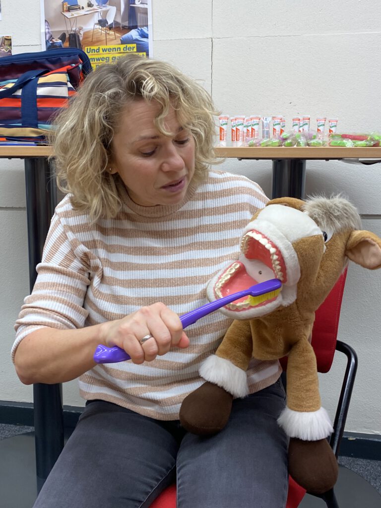 Bianca Kampke arbeitet beim Landkreis Wittmund. Sie kommt mindestens zweimal im Schuljahr zu uns in die Schule um uns zu zeigen, wie die Zähne richtig geputzt werden. Außerdem erklärt sie uns, welche Lebensmittel und Getränke gut für unsere Zähne sind und was passiert, wenn wir unsere Zähne nicht gut pflegen.
